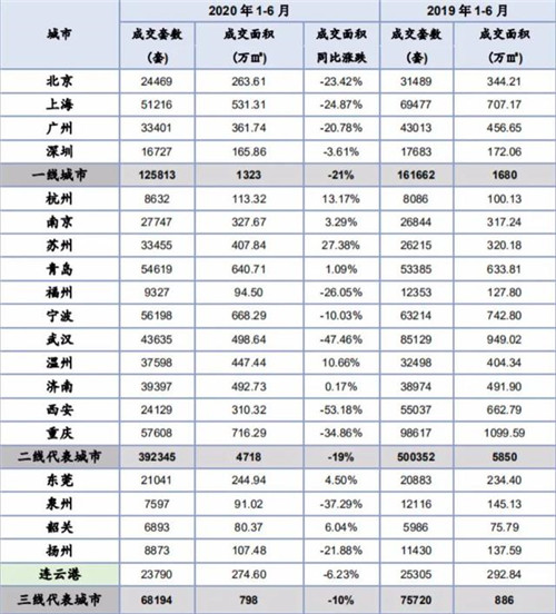 2020年1~6月全國(guó)主要城市成交情況 數(shù)據(jù)來(lái)源:中指院