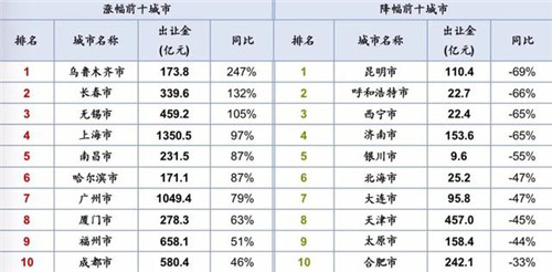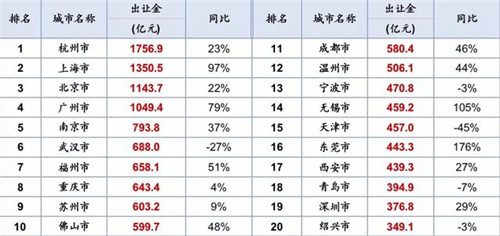 排名前20的城市土地成交總額超過(guò)成交總額的半壁江山,達(dá)13763.8億元,同比增加18%,但上榜門(mén)檻降至349.1億元。