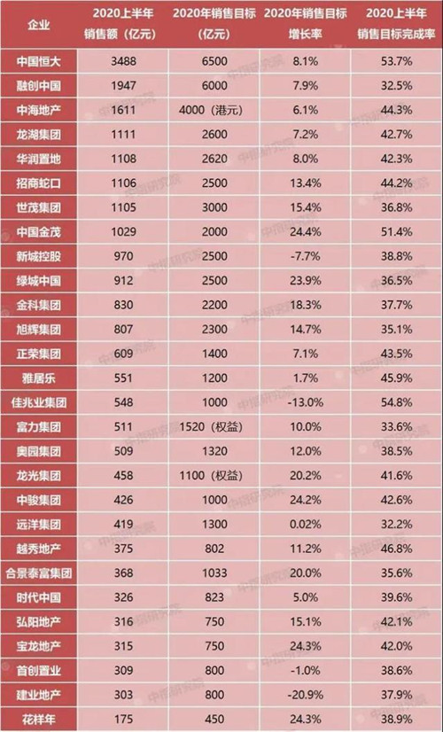 但公布2020年業(yè)績(jī)目標(biāo)的28家房企中,目標(biāo)完成率均值僅41.1%,同比下降6.5個(gè)百分點(diǎn)。完成業(yè)績(jī)目標(biāo)超40%的僅14家企業(yè),部分房企掉隊(duì)嚴(yán)重,如遠(yuǎn)洋集團(tuán)上半年目標(biāo)完成率僅32.2%,奧園僅完成38.5%,富力集團(tuán)完成33.6%。