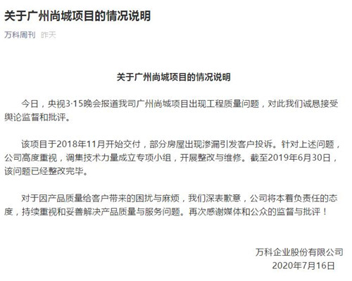 對此,萬科深夜發(fā)布回應(yīng)稱,對此誠懇接受輿論監(jiān)督和批評。該項(xiàng)目于2018年11月開始交付,部分房屋出現(xiàn)滲漏引發(fā)客戶投訴。針對上述問題,公司高度重視,調(diào)集技術(shù)力量成立專項(xiàng)小組,開展整改與維修。截至2019年6月30日,該問題已經(jīng)整改完畢。