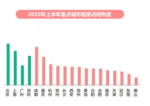 不同城市的租房訪(fǎng)問(wèn)熱度來(lái)看,2020年上半年,一線(xiàn)城市中北京的租房熱度依然領(lǐng)先全國(guó),二季度北京的租房訪(fǎng)問(wèn)熱度同比上漲11.8%。新一線(xiàn)城市中,作為網(wǎng)紅城市的成都租房熱度不減,熱度僅低于北京,二季度成都租房訪(fǎng)問(wèn)熱度同比上漲1.0%;重慶、杭州、鄭州等新一線(xiàn)城市的租房熱度排名也相對(duì)靠前。