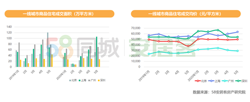 值得注意的是,一線城市新房商品住宅成交量回升。2020年1-5月,一線四城商品住宅成交量同比下降26.7%,但3月后成交量出現(xiàn)明顯回升,5月上海商品住宅成交超百萬平方米;成交價格方面,一線城市商品住宅成交均價有一定程度的波動,5月份上海成交均價超6萬元/平方米。