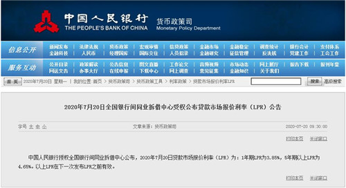 房訊網(wǎng)訊 7月20日,央行公布7月份LPR報(bào)價(jià)。中國(guó)人民銀行授權(quán)全國(guó)銀行間同業(yè)拆借中心公布,2020年7月20日貸款市場(chǎng)報(bào)價(jià)利率(LPR)為:1年期LPR為3.85%,5年期以上LPR為4.65%。至此,LPR與上月持平,并且已連續(xù)四個(gè)月維持不變。