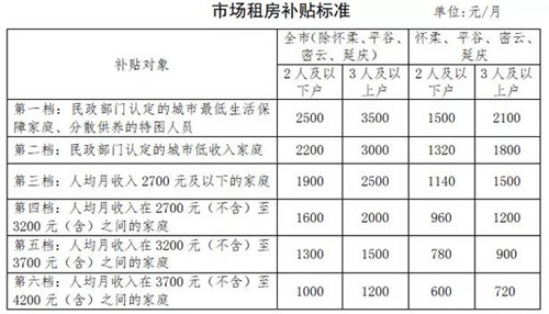 除懷柔、平谷、密云、延慶外的其他區(qū),2人及以下戶最高補貼標(biāo)準(zhǔn)由1600元提高到2500元,最低補貼標(biāo)準(zhǔn)由200元提高到1000元;3人及以上戶最高補貼標(biāo)準(zhǔn)由2000元提高到3500元,最低補貼標(biāo)準(zhǔn)由200元提高到1200元,相比之前政策,市場租房補貼標(biāo)準(zhǔn)有大幅提高。