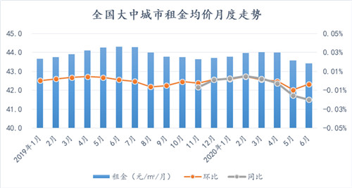 《報(bào)告》顯示,2020年6月,全國(guó)大中城市月租金掛牌均價(jià)為每平方米43.42元,環(huán)比微降0.36%,同比下降2.02%,環(huán)比降幅有所縮小。全國(guó)大中城市租金均價(jià)連續(xù)3月下滑,租賃市場(chǎng)的活躍度仍較弱。