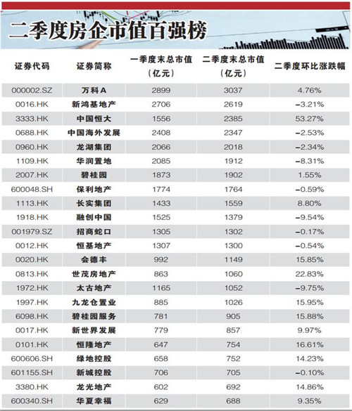 在百強市值房企中,二季度市值漲幅超過50%的有四家企業(yè),分別是格力地產(chǎn)、張江高科、寶龍商業(yè)以及中國恒大;而二季度市值縮水最嚴重的房企則有SOHO中國、大名城、首開股份、富力地產(chǎn)以及融信中國,跌幅均超過10%。