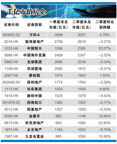 據(jù)中國房地產(chǎn)報二季度市值百強榜單顯示,從個股表現(xiàn)來看,由于二季度多數(shù)地產(chǎn)股均實現(xiàn)上漲,因此千億市值的房企數(shù)量本季度內(nèi)有所增加,已達到16家。其中,會德豐、世茂房地產(chǎn)、九龍倉置業(yè)是季度內(nèi)新晉的三家千億市值房企。