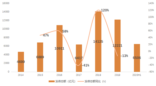 2020年上半年房企境內(nèi)外融資折合人民幣合計約為6506億,占比2019年全年融資規(guī)模53%。受海外疫情影響,4月全月無新增海外債券,對整體融資規(guī)模有一定影響,但境內(nèi)債市表現(xiàn)活躍,從而對沖海外債市的短暫低迷。