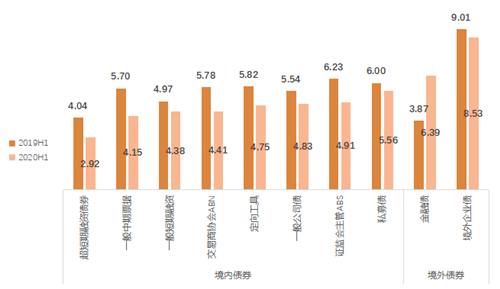 整體:從兩年利率變化上,可以明顯看出2020年上半年較2019年同期整體利率下行,境內(nèi)債券相較于境外債券下降幅度更大。2020年上半年境外債中金融債的利率水平高于去年同期,是由于2020年上半年僅保利發(fā)行單支金融債,偶發(fā)因素較強,不能影響上半年整體利率低位的趨勢。