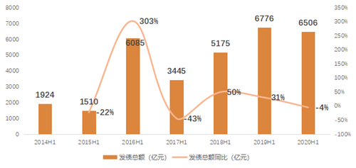 房企上半年境內(nèi)外融資較2019年同期下降4個百分點,但處于歷史較高水平。全球疫情下,房企融資規(guī)模端未出現(xiàn)大幅下滑,整體平穩(wěn),房企在債市表現(xiàn)超預(yù)期。