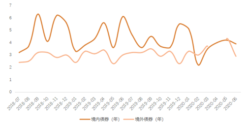 今年上半年整體境內(nèi)外債券期限經(jīng)歷從2月到5月的不斷拉長,6月開始縮短的變化。2月境內(nèi)超短期融資最為活躍,單月融資平均周期僅為2.2年,達24個月內(nèi)最低值,也因此被境外融資周期超越;隨著投資人信心逐步恢復(fù),發(fā)債周期也隨機拉長。3-5月,5年周期的債券發(fā)行占主要比重,進入6月,3年期融資債券占主導(dǎo),整體發(fā)債周期有縮短趨勢。