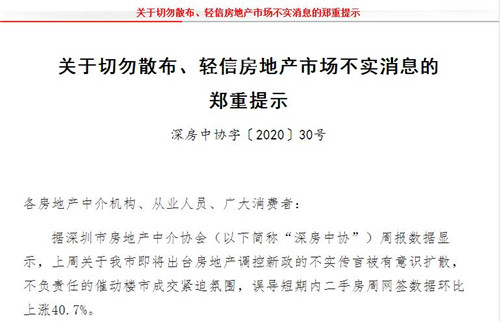 房訊網訊 昨日,深圳市房地產中介協(xié)會發(fā)文提示各房地產中介機構、從業(yè)人員、廣大消費者切勿散布、輕信房地產市場不實消息。