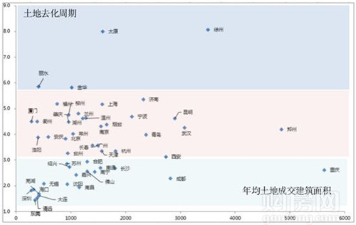 50城市近三年平均土地成交與土地去化周期(單位:萬平方米、年)
