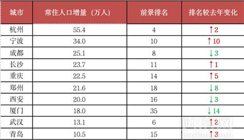 人口增量在TOP15的二線城市譬如杭州、重慶、寧波、合肥、青島等城市的綜合前景排名都有所上升。其中,杭州由于發(fā)達的互聯(lián)網(wǎng)產(chǎn)業(yè)、良好的環(huán)境,成為這一輪搶人大戰(zhàn)的最佳受益城市之一,2019年常住人口增量居全國首位。