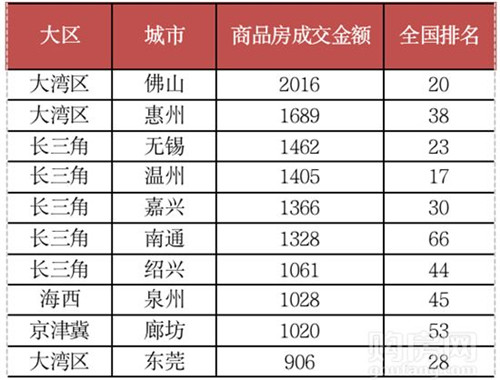 三四線城市中投資前景較好的城市仍然集中在長三角和大灣區(qū)兩大城市圈。單從2018年商品房成交金額來看,排名靠前的除泉州和廊坊外,其余均來自大灣區(qū)和長三角兩大城市群。其中大灣區(qū)共有3個城市進入前10,分別是佛山、惠州和東莞;長三角入榜城市最多,共有5個城市,并且成交金額均超過了1000億元。