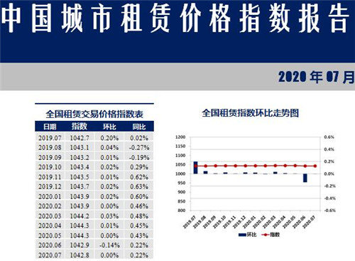 由易居企業(yè)集團(tuán)、上海易居房地產(chǎn)研究院中國房地產(chǎn)測評中心、華東師范大學(xué)東方房地產(chǎn)研究院三方共同發(fā)布的《2020年7月中國城市住房租賃價(jià)格指數(shù)報(bào)告》顯示,7月份中國城市租賃價(jià)格指數(shù)為1042.8點(diǎn),較上月下降0.1點(diǎn),與上月基本持平,同比漲幅0.22%。從走勢來看,該指數(shù)在經(jīng)歷了18個月上漲后,連續(xù)出現(xiàn)兩個月下跌的態(tài)勢。