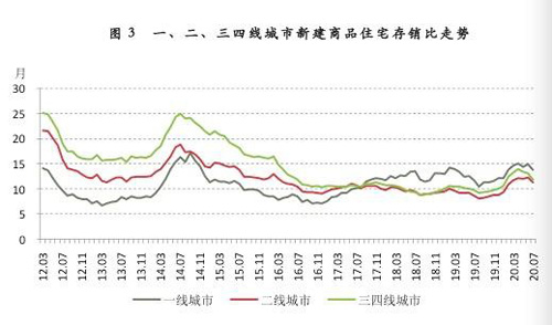 報(bào)告稱,觀察今年1~7月份數(shù)據(jù),全國100城存銷比,即庫存去化周期,呈現(xiàn)了比較明顯的“倒U型”走勢(shì)。在今年前4月,100城去庫存明顯受到了疫情的沖擊,去庫存周期陡然攀升,甚至超過了1年的水平。而5月份開始,去化壓力總體有所緩解,當(dāng)前已回落到1年以下的水平。7月份,100個(gè)城市新建商品住宅存銷比為11.7個(gè)月,這也意味著市場(chǎng)消化完這些庫存需要11.7個(gè)月的時(shí)間。