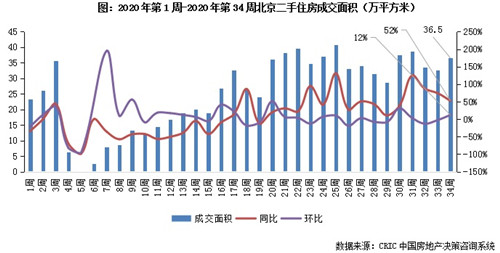 克而瑞研究中心數(shù)據(jù)顯示,2020年第34周(8月17日至8月23日),北京二手住房成交面積環(huán)比回升12%至36.5萬平方米,繼連續(xù)兩周回調后成交規(guī)模如期上揚,但同比增速收窄至52%。因此預計后續(xù)成交規(guī)模將維持高位但環(huán)比漲幅將收窄。