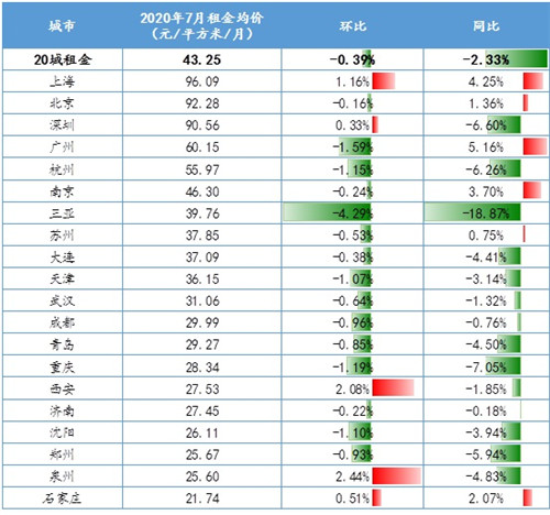 數(shù)據(jù)顯示,7月,一線城市月平均租金為每平方米92.98元,環(huán)比上升0.45%,同比下降0.44%;重點二線城市為34.47元,環(huán)比下跌0.78%,同比下跌3.19%。一線城市租金水平在連續(xù)下降3個月后止跌轉(zhuǎn)漲,環(huán)比上漲0.45%;二線重點城市租金繼續(xù)下滑,相比上月跌幅擴大0.32個百分點。