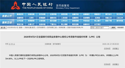 房訊網(wǎng)訊 9月21日,央行官網(wǎng)剛剛發(fā)布公告稱(chēng),中國(guó)人民銀行授權(quán)全國(guó)銀行間同業(yè)拆借中心公布,2020年9月21日貸款市場(chǎng)報(bào)價(jià)利率(LPR)為:1年期LPR為3.85%,5年期以上LPR為4.65%。以上LPR在下一次發(fā)布LPR之前有效。