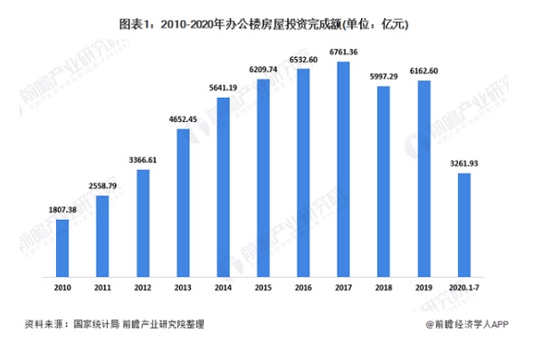 2010-2017年我國辦公樓投資完成額逐年上升,2017年達(dá)到近年來的最高值6761.36億元,隨后投資額有所下降。2019年我國辦公樓完成投資額6162.60億元,同比增長2.76%。