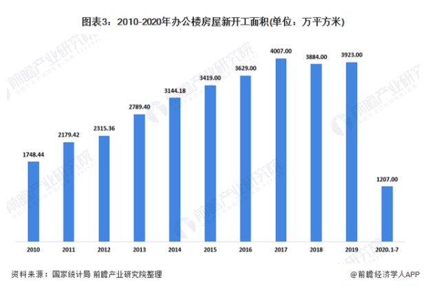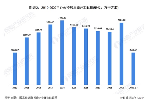2010-2014年我國辦公樓新開工面積呈上升趨勢,2014年達(dá)到7349.10萬平方米,為近年來的最高值。2015-2018年辦公樓新開工面積逐年下降,2019年新開工面積回升到7084萬平方米,同比增長17.11%。