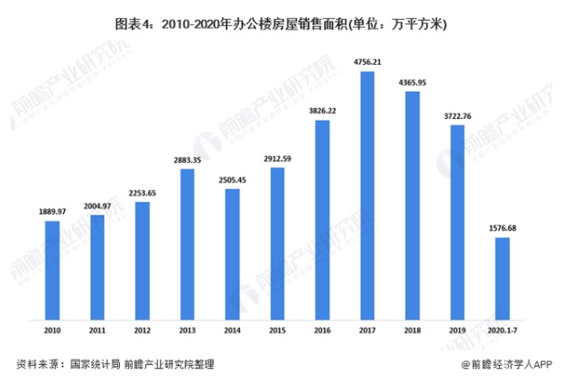 2010-2017年,全國辦公樓房屋銷售面積逐年上升,2017年達(dá)到4756.21萬平方米,為近年來最高值,2018-2019年房屋竣工面積出現(xiàn)下降,2019年為3722.76萬平方米,同比下降14.73%。