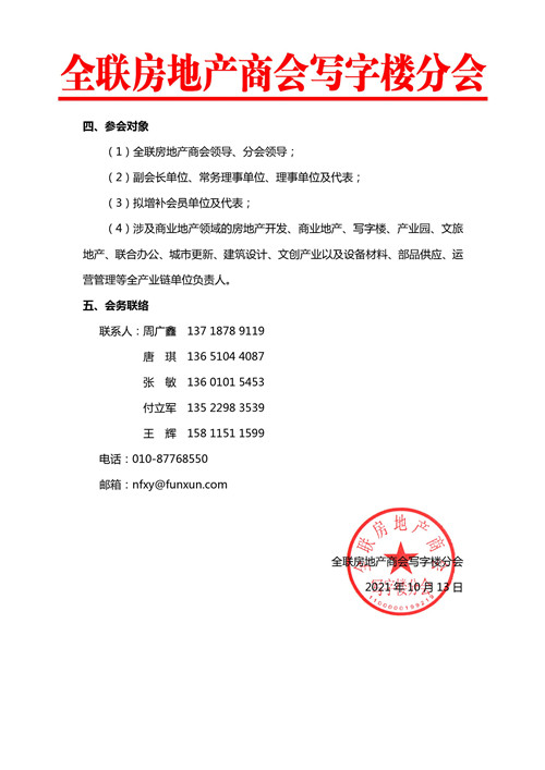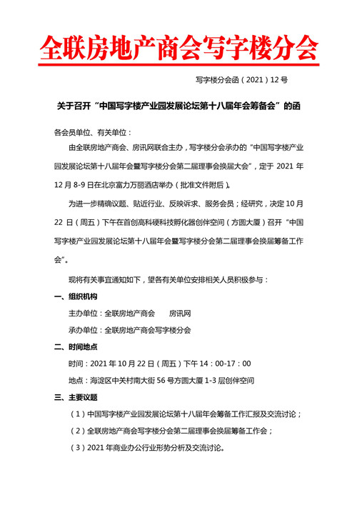 通知顯示,由全聯(lián)房地產(chǎn)商會(huì)、房訊網(wǎng)聯(lián)合主辦,寫(xiě)字樓分會(huì)承辦的"中國(guó)寫(xiě)字樓產(chǎn)業(yè)園發(fā)展論壇第十八屆年會(huì)暨寫(xiě)字樓分會(huì)第二屆理事會(huì)換屆大會(huì)",將于2021年12月8-9日在北京富力萬(wàn)麗酒店舉辦。