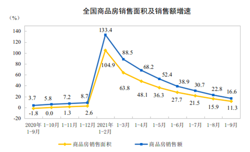 1—9月份,商品房銷售面積130332萬(wàn)平方米,同比增長(zhǎng)11.3%;比2019年1—9月份增長(zhǎng)9.4%,兩年平均增長(zhǎng)4.6%。其中,住宅銷售面積增長(zhǎng)11.4%,辦公樓銷售面積增長(zhǎng)3.1%,商業(yè)營(yíng)業(yè)用房銷售面積增長(zhǎng)0.7%。商品房銷售額134795億元,增長(zhǎng)16.6%;比2019年1—9月份增長(zhǎng)20.9%,兩年平均增長(zhǎng)10.0%。其中,住宅銷售額增長(zhǎng)17.8%,辦公樓銷售額增長(zhǎng)0.5%,商業(yè)營(yíng)業(yè)用房銷售額增長(zhǎng)0.5%。