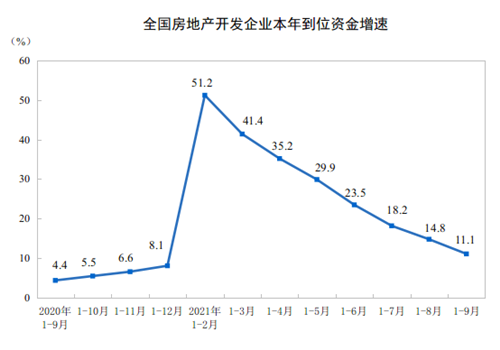 1—9月份,房地產(chǎn)開發(fā)企業(yè)到位資金151486億元,同比增長(zhǎng)11.1%;比2019年1—9月份增長(zhǎng)16.0%,兩年平均增長(zhǎng)7.7%。其中,國(guó)內(nèi)貸款18770億元,下降8.4%;利用外資59億元,下降36.9%;自籌資金47212億元,增長(zhǎng)6.1%;定金及預(yù)收款56689億元,增長(zhǎng)25.6%;個(gè)人按揭貸款24124億元,增長(zhǎng)10.7%。