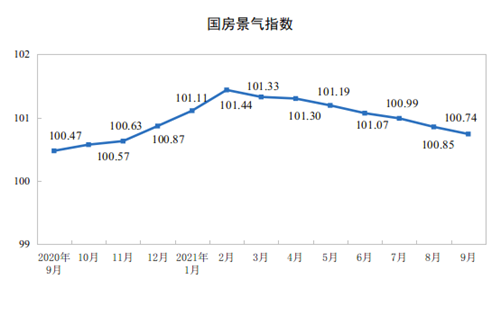 9月份,房地產(chǎn)開發(fā)景氣指數(shù)(簡(jiǎn)稱“國(guó)房景氣指數(shù)”)為100.74。