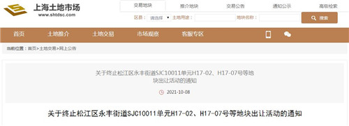 房訊網(wǎng)訊 10月8日,上海土地市場(chǎng)網(wǎng)發(fā)布《關(guān)于終止松江區(qū)永豐街道SJC10011單元H17-02、H17-07號(hào)等地塊出讓活動(dòng)的通知》,對(duì)第二批集中供地中7幅地塊終止出讓。