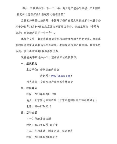 房訊網(wǎng)訊 日前,全聯(lián)房地產(chǎn)商會(huì)發(fā)布《關(guān)于召開"中國寫字樓產(chǎn)業(yè)園發(fā)展論壇第十八屆年會(huì)"的通知》,中國寫字樓產(chǎn)業(yè)園發(fā)展論壇第十八屆年會(huì)定于2021年12月8-9日在北京富力萬麗酒店舉行,論壇主題為"變局與破局:商業(yè)地產(chǎn)的下一個(gè)十年"。