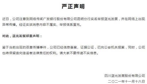 對此,藍光發(fā)展鄭重聲明:鑒于當前出現(xiàn)的惡意傳播事件,公司已經(jīng)信息備案、證據(jù)公證,已向公安機關(guān)報案,同時,公司也將保留追究造謠者法律責任的權(quán)利。請大家不要傳遞不實信息。