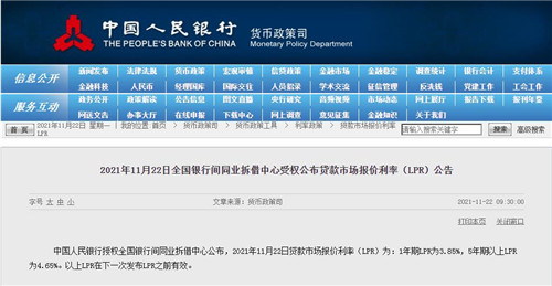 房訊網(wǎng)訊 中國人民銀行授權(quán)全國銀行間同業(yè)拆借中心公布,2021年11月22日貸款市場報(bào)價利率(LPR)為:1年期LPR為3.85%,5年期以上LPR為4.65%。兩個期限品種報(bào)價均與上期持平,這已是LPR連續(xù)19個月保持不變。