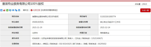 房訊網(wǎng)訊 11月29日,北京產(chǎn)權(quán)交易中心平臺披露首置物業(yè)服務(wù)有限公司100%股權(quán)轉(zhuǎn)讓信息,轉(zhuǎn)讓底價4.5億元。標的公司由首創(chuàng)置業(yè)有限公司100%持股,成立日期為2012年5月8日,注冊資本1億元,法定代表人為林智勇,所屬行業(yè)為商務(wù)服務(wù)業(yè)。