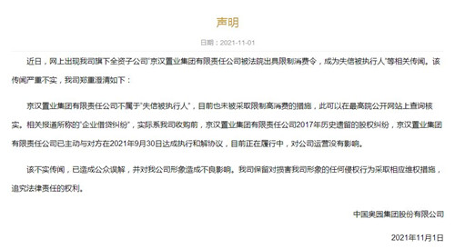 聲明中稱,京漢置業(yè)集團有限責任公司不屬于“失信被執(zhí)行人”,目前也未被采取限制高消費的措施,此可以在最高院公開網(wǎng)站上查詢核實。