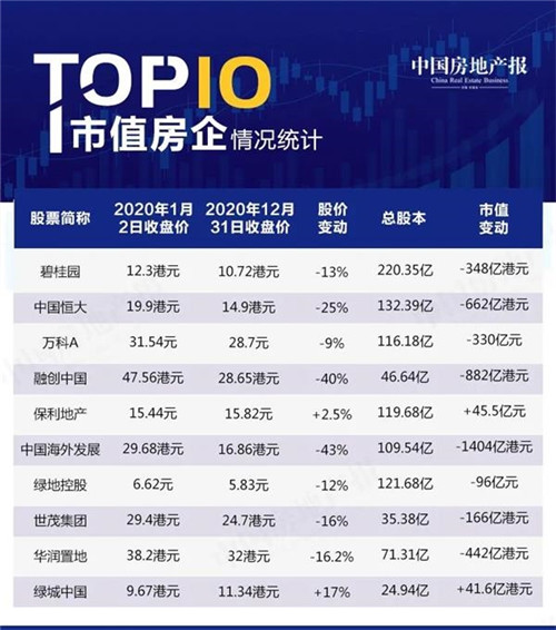 在股價下跌的8家房企中,跌幅最小的是萬科A,從年初的31.54元下降到了年末的28.7元,跌幅約9%,市值縮水了330億元,截至2020年12月31日,總市值仍有3334億元。跌幅最大的是中國海外發(fā)展,股價從29.68港元跌到了16.86港元,跌幅達43%,市值沒了1404億港元。股價跌了四成的還有融創(chuàng)中國,一年時間,市值蒸發(fā)了882億港元。而碧桂園、華潤置地、綠地控股、世茂集團等公司,跌幅則在12%-25%。
