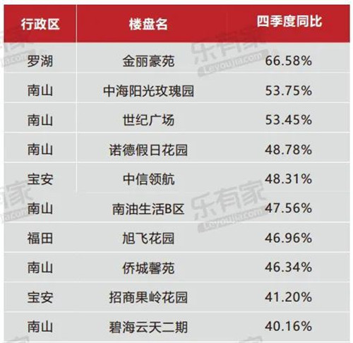 2020年深圳二手住宅樓盤價格漲幅排行榜 來源:樂有家研究中心