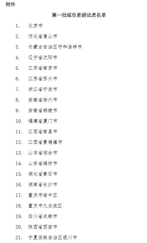 房訊網(wǎng)訊 近日,住房和城鄉(xiāng)建設(shè)部辦公廳發(fā)布《關(guān)于開展第一批城市更新試點(diǎn)工作的通知》,要求貫徹落實(shí)黨的十九屆五中全會精神,完整、準(zhǔn)確、全面貫徹新發(fā)展理念,積極穩(wěn)妥實(shí)施城市更新行動,引領(lǐng)各城市轉(zhuǎn)型發(fā)展、高質(zhì)量發(fā)展,決定在北京等21個城市(區(qū))開展第一批城市更新試點(diǎn)工作。