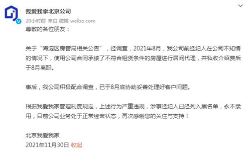 對(duì)此,我愛我家北京公司11月30日在微博回應(yīng)稱,經(jīng)調(diào)查,2021年8月,公司前經(jīng)紀(jì)人在公司不知情的情況下,使用公司合同承接了不符合租賃條件的房屋進(jìn)行居間代理,并私收介紹費(fèi)后于8月離職。事后,公司積極配合調(diào)查,已于8月底協(xié)助妥善處理好客戶問題。