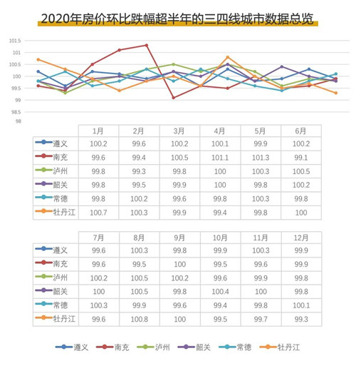 記者梳理2020年1月至12月份全國70個大中城市商品住宅銷售價格變動情況發(fā)現(xiàn),遵義、南充、韶關(guān)、瀘州、常德、牡丹江這6個分布在不同區(qū)域的三四線城市,全年新建商品住宅價格環(huán)比下跌時長竟超過6個月。