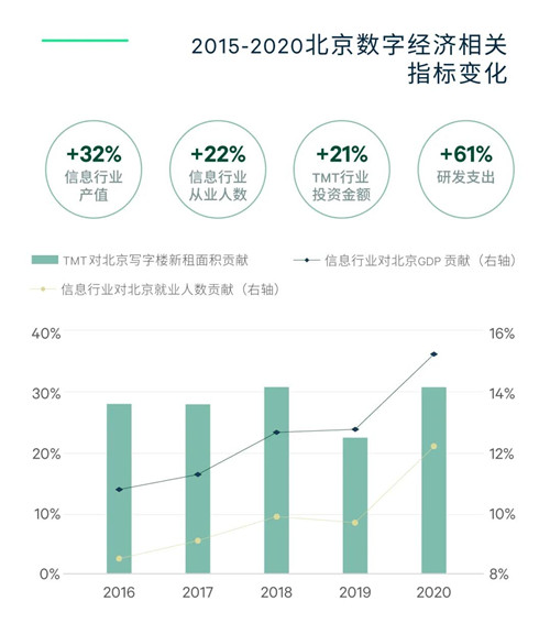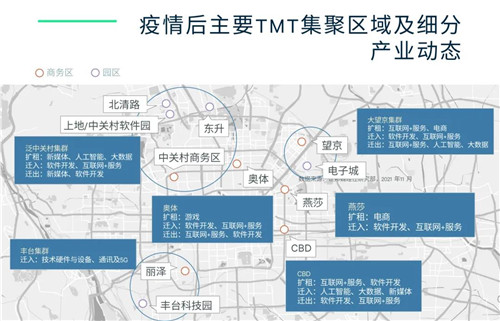 根據(jù)報告可知,TMT產(chǎn)業(yè)早已成為商業(yè)地產(chǎn)需求的支柱行業(yè)之一,2020年,TMT企業(yè)對北京寫字樓新租面積貢獻高達32%;中關(guān)村、望京商務(wù)區(qū)的數(shù)字企業(yè)集聚優(yōu)勢凸顯,企業(yè)的旺盛需求也帶動了商務(wù)區(qū)周邊園區(qū)產(chǎn)業(yè)辦公的發(fā)展。