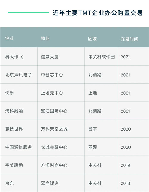 根據(jù)CBRE世邦魏理仕報告,數(shù)字經(jīng)濟需求結(jié)構(gòu)在近五年更趨集中于成熟的頭部企業(yè)。近年,TMT頭部企業(yè)通過購置辦公的方式,解決自身大體量或高速擴張的員工辦公空間需求,成為北京辦公投資的重要力量。2021年前三季度,TMT頭部企業(yè)購置辦公交易占北京辦公用途總投資額的23%。