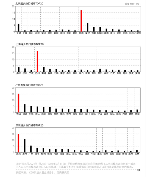一線城市工作人群的熱門返鄉(xiāng)城市主要分為三大類城市,一是周邊距離較近的城市,例如北京對廊坊、天津等,上海對蘇州、嘉興等,深圳對東莞、惠州等,廣州對佛山、清遠(yuǎn)等;二是勞務(wù)輸出大市,例如同在北京、上海節(jié)前熱門遷出城市前20城的河南周口、信陽等;三是北上廣深發(fā)達(dá)城市之間,因?yàn)榻?jīng)濟(jì)發(fā)達(dá)、聯(lián)系密切,人員流動也高于其他城市。(新京報(bào))