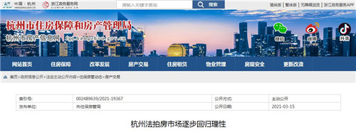 3月3日,杭州發(fā)布《關于進一步規(guī)范房地產(chǎn)市場秩序的通知》以來,34套杭州限購范圍內(nèi)的法拍房競拍,其中23套住房最終成交價低于評估價,4套流拍,法拍房降溫,市場逐步回歸理性。