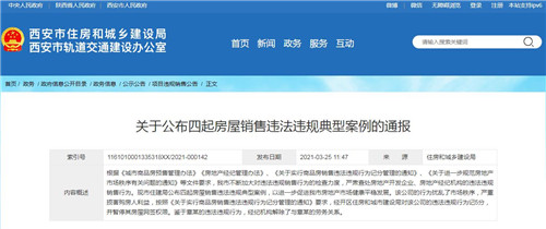 房訊網(wǎng)訊 3月25日,西安市住建局官網(wǎng)公布四起房屋銷售違法違規(guī)典型案例,加大對違法違規(guī)銷售行為的檢查力度,嚴肅查處房地產(chǎn)開發(fā)企業(yè)、房地產(chǎn)經(jīng)紀機構(gòu)的違法違規(guī)銷售行為。