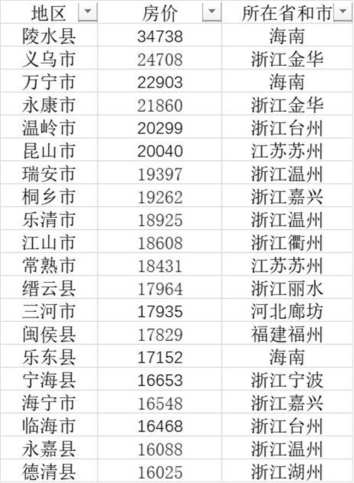 縣域房價(jià)前20名 (房價(jià)單位:元/平方米)