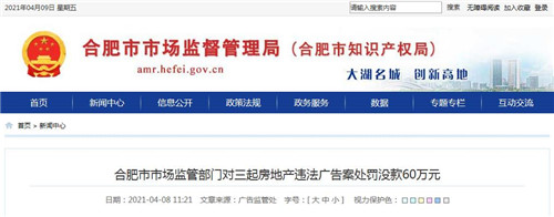 房訊網(wǎng)訊 據(jù)合肥市市場(chǎng)監(jiān)督管理局消息,近日,合肥市市場(chǎng)監(jiān)管部門(mén)對(duì)三起發(fā)布房地產(chǎn)違法廣告的行為進(jìn)行立案調(diào)查,作出罰沒(méi)款共60萬(wàn)元的行政處罰。