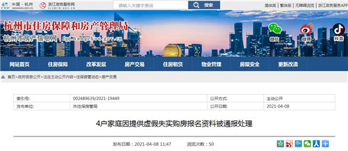 房訊網訊 4月8日,杭州市住房保障和房產管理局發(fā)布通報,對在商品住房公證搖號登記過程中提供虛假購房報名資料的4戶家庭作出了“一年內不再受理限購查檔申請”的通報處理。